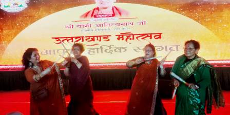 कार्यक्रम का शुभारंभ दीप प्रज्वलन और “जय बद्री विशाल” के उद्घोष के साथ हुआ। इसके बाद “बेडू पाको बारामासा”, “फुलदेई छम्मा छम्मा”, “छोड़ दे दैय्या बासंती”, “म्यर पहाड़”, “झुमका गिरा रै नैनीताल मा” और “घुघूती बसूती” जैसे लोकप्रिय पहाड़ी गीतों की धुनों पर पारंपरिक डांडिया नृत्य प्रस्तुत किया गया। छड़ियों की झंकार और सुरों की गूंज से पूरा वातावरण उत्सवमय हो उठा।