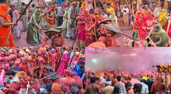 गगनभेदी जयकारों और राधे-राधे के उद्घोष से पूरा बरसाना भक्तिरस में डूबा दिखाई दिया। मंदिरों से लेकर रंगीली गली तक श्रद्धालुओं की भारी भीड़ उमड़ी रही। ऊंची छतों और भवनों पर खड़े लोग इस अलौकिक दृश्य को निहारते रहे। ढालों पर बरसती लाठियां और उड़ता गुलाल सदियों पुरानी परंपरा को सजीव करता नजर आया। श्रद्धालु इसे राधारानी की लीला मानकर भावविभोर हो उठे। इस बार लठामार होली का दृश्य और भी भव्य रहा। नंदगांव के हुरियारों के स्वागत में हेलीकॉप्टर से गुलाब की पंखुड़ियों की वर्षा की गई। आसमान से बरसती पंखुड़ियों ने पूरे माहौल को और अधिक भक्तिमय बना दिया। श्रद्धालुओं ने इस अद्भुत पल को अपने मोबाइल कैमरों में कैद किया और इसे राधारानी की कृपा बताया।
