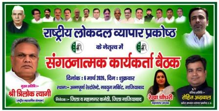 लखनऊ। राष्ट्रीय लोकदल के व्यापार प्रकोष्ठ की ओर से छह मार्च 2026, शुक्रवार को दोपहर 12 बजे गाजियाबाद में एक महत्वपूर्ण संगठनात्मक बैठक आयोजित की जाएगी। यह बैठक नवयुग मार्केट स्थित अन्नपूर्णा रेस्टोरेंट के प्रथम तल पर संपन्न होगी। बैठक को लेकर पदाधिकारियों और कार्यकर्ताओं में उत्साह का माहौल है।