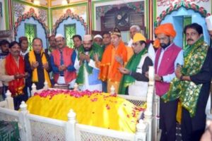 लखनऊ 2 नवम्बर| हिंदू मुस्लिम एकता की प्रतीक हज़रत ख़्वाजा मोहम्मद नबी रजा शाह दादा मियां के 114 वें सालाना उर्स के अंतिम दिन आज उत्तर प्रदेश जिला मान्यता प्राप्त पत्रकार एसोसिएशन ने समाज सेवियों के साथ मॉल एवेन्यू स्थित दरगाह पर चादर पेश की और मुल्क में सबकी खुशहाली, एकता, अखण्डता और अमन-चैन की दुआ की। इस अवसर पर उपस्थित सभी लोगो का स्वागत करते हुए दरगाह के सज्जादा नशीन ख्वाजा मोहम्मद शबाहत हसन ने कहा कि आज समाज में सबका भला तभी हो सकता है जब हम सब एक साथ मिलजुल कर रहे हैं। सज्जादानशीन ने सभी पत्रकारों- छायाकारों को पगड़ी बांधकर सम्मानित किया।