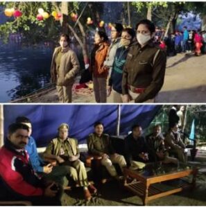 साथ ही सुरक्षा व्यवस्था में एक महिला दरोगा 10 महिला आरक्षी के साथ एवं डॉक्टरों की एक टीम के साथ एंबुलेंस मौके पर मौजूद रही। पूजा के दौरान घाट की शोभा बढ़ाने में पीएसी की बैंड टीम भी पीछे नहीं रही।